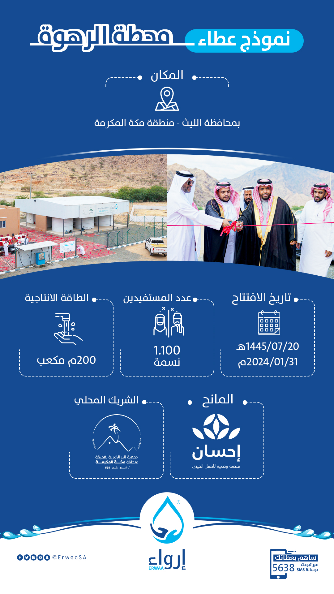 برعاية رئيس مركز الرهوة الأستاذ/ فيصل بن منور السلمي، ودعم من منصة #إحسان. جمعية إرواء ممثلةً بالمدير التنفيذي الأستاذ/متعب المسيند تدشن محطة (الرهوة) لتحلية المياه بحضور أعضاء الجمعية المحلية الشريكة (جمعية البر الخيرية بمركز غميقة) وجمع من الوجهاء والأهالي.