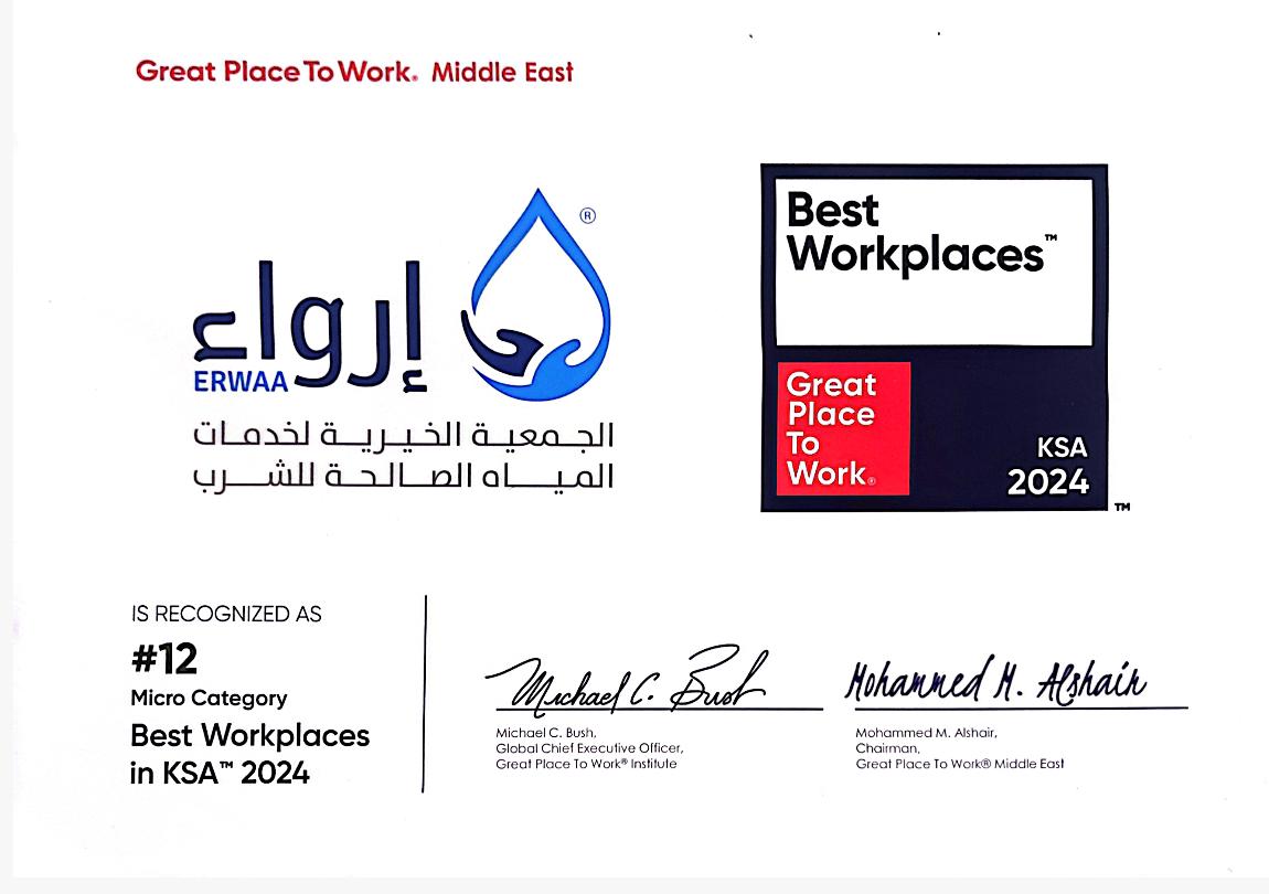 حققت جمعية إرواء لخدمات المياه إنجازا مهما بحصولها على المركز الثاني عشر كأفضل بيئة عمل في المملكة العربية السعودية للمنشآت الصغيرة خلال حفل توزيع جوائز منظمة Great Place to Work.