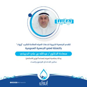 تتقدم جمعية إرواء بالتهنئة لسعادة الدكتور: عبدالله بن علي الدبيخي، عضو الجمعية العمومية بمناسبة تعيينه.... المزيد